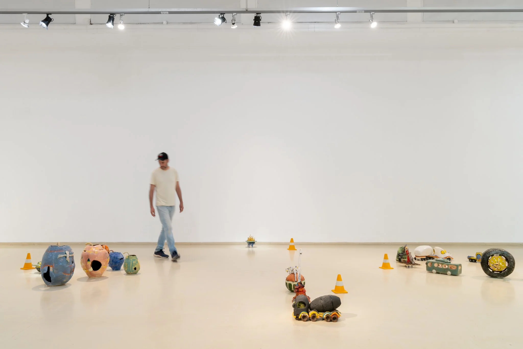 Sculptural clusters are on the floor, converging, disassembling, and turning in multiple directions, with no specific center. Some seem like fragments of a dream, an anecdote, a fable, or a riddle. Others look like scenes after an accident or disaster, paved with artifacts that need to be pieced together and deciphered. Together, they make up a wild world of clay sculptures, full of mise-en-scenes and tiny stories – surreal, grotesque, or threatening; a puzzle of ancient myths, archetypal representations, and fragments of thoughts.