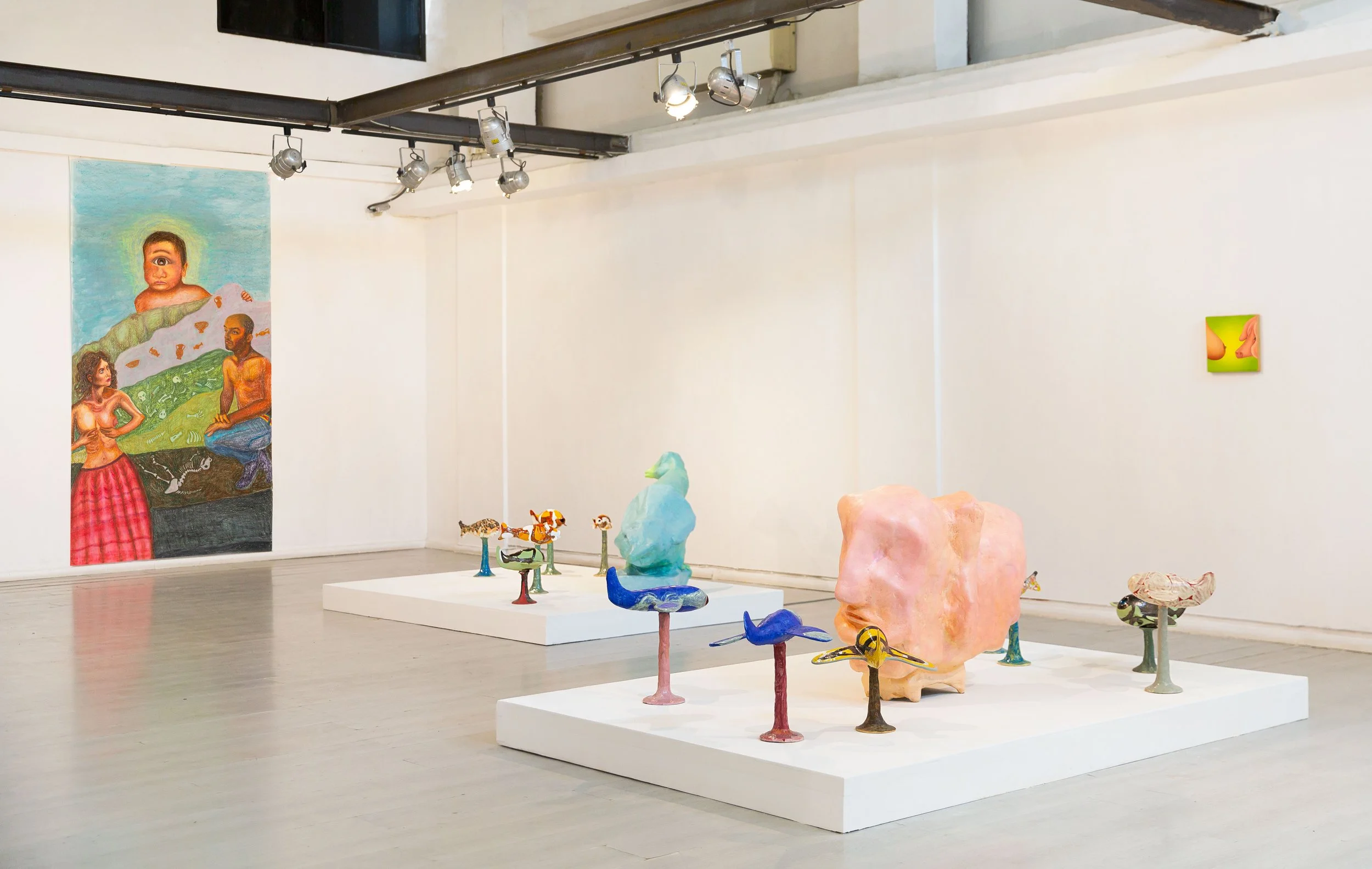 Like a negative inversion, a different, formless substance hovers over the sculptural space. A single picture lives between the sculpted, heavy clay creatures that have sunk to the floor and the hall's ceiling, grabbing both planes at once.